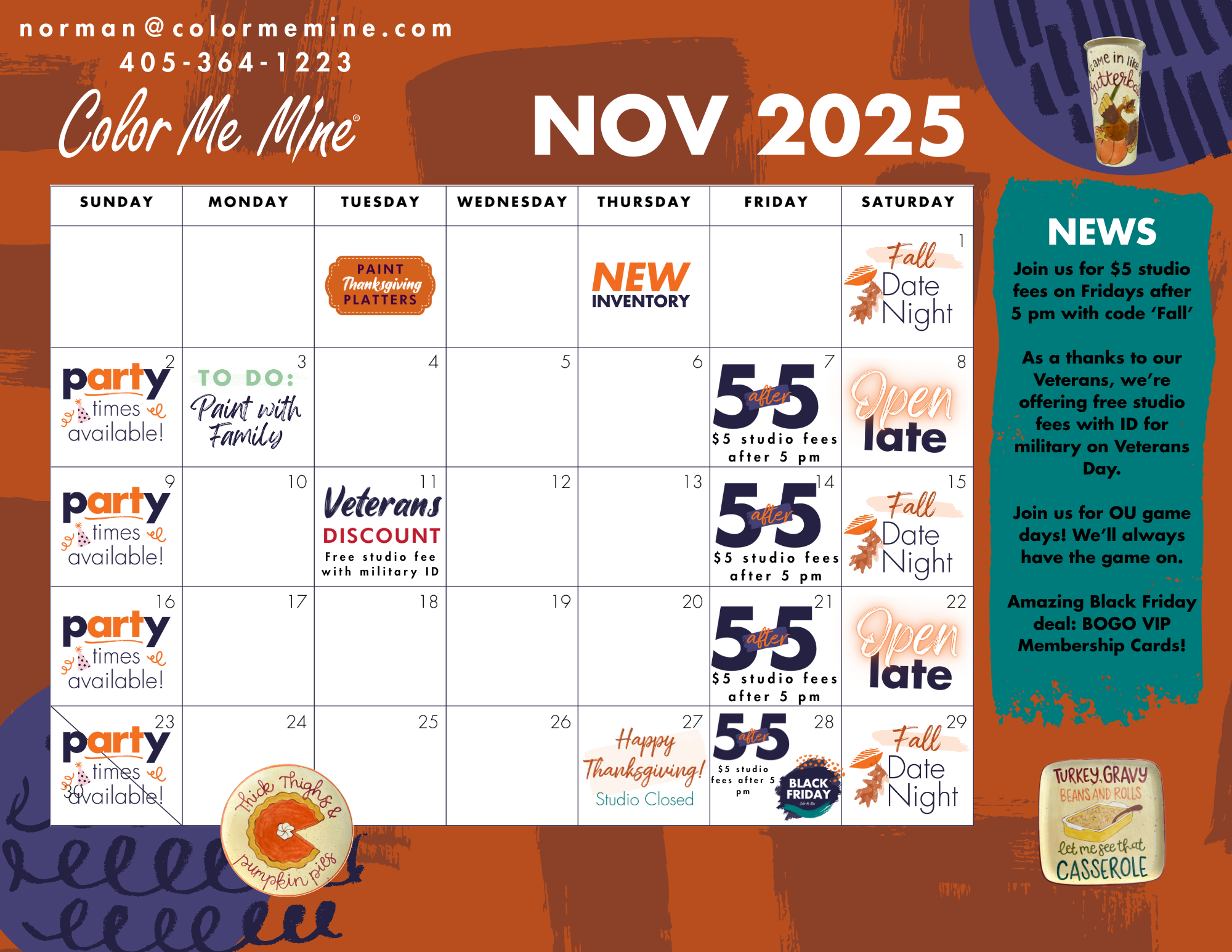 Painting isn't just for kids! Check our calendar and social media accounts for events like Ladies Night Out, Date Nights and Workshops.